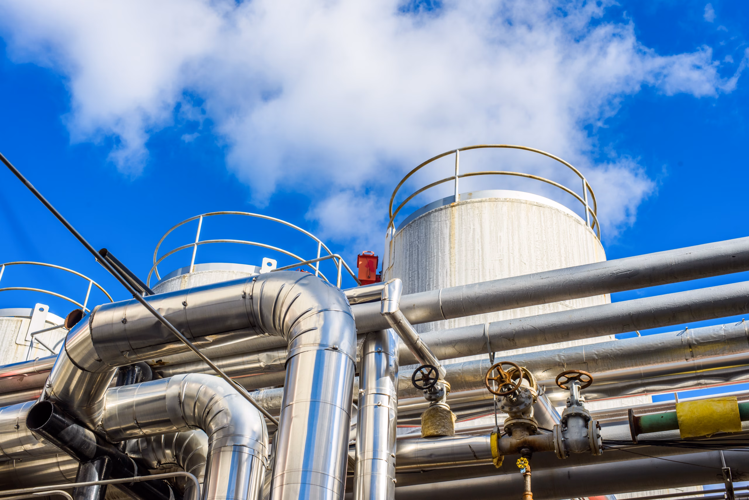 Industrial piping and storage tanks at biofuel plant